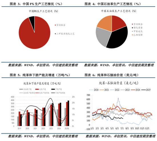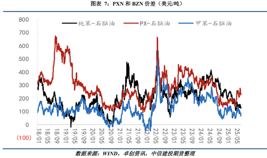 最后,PX与纯苯的强制联产特性或使其存在结构性溢价,但产业链亦需承受副产品过剩与调油分流所带来的压力。PX与纯苯存在生产上高度联动,约94%的PX和80%的石油苯源自相同原料。俄乌冲突后,PXN和BZN价差的正相关性显著增强,然而,2025年上半年受供应端检修较多影响,PX市场呈现深度Back结构,这种结构性紧张支撑PXN走强,而BZN因纯苯供需宽松承压,两者呈现阶段性背离。纯苯作为副产品,其单一产品利润对装置整体开工影响有限,炼厂决策更依赖综合利润,展望下半年,纯苯面临供增需减格局,库存或持续累积,在此背景下,炼厂维持PX和纯苯装置高开工的核心驱动力在于最大化PXN价差带来的高利润以覆盖整体运行,即使这可能加剧纯苯自身的过剩压力。此外,甲苯歧化经济性亦是调节因素,当甲苯歧化经济性优于调油时,炼厂更倾向于将甲苯进行歧化反应,直接提升PX产量。但需警惕若成品油库存低位叠加地缘冲突引发成本波动,可能迫使炼厂优先增产汽油,进而推升PX成本并打破与纯苯传统的“跷跷板”效应。